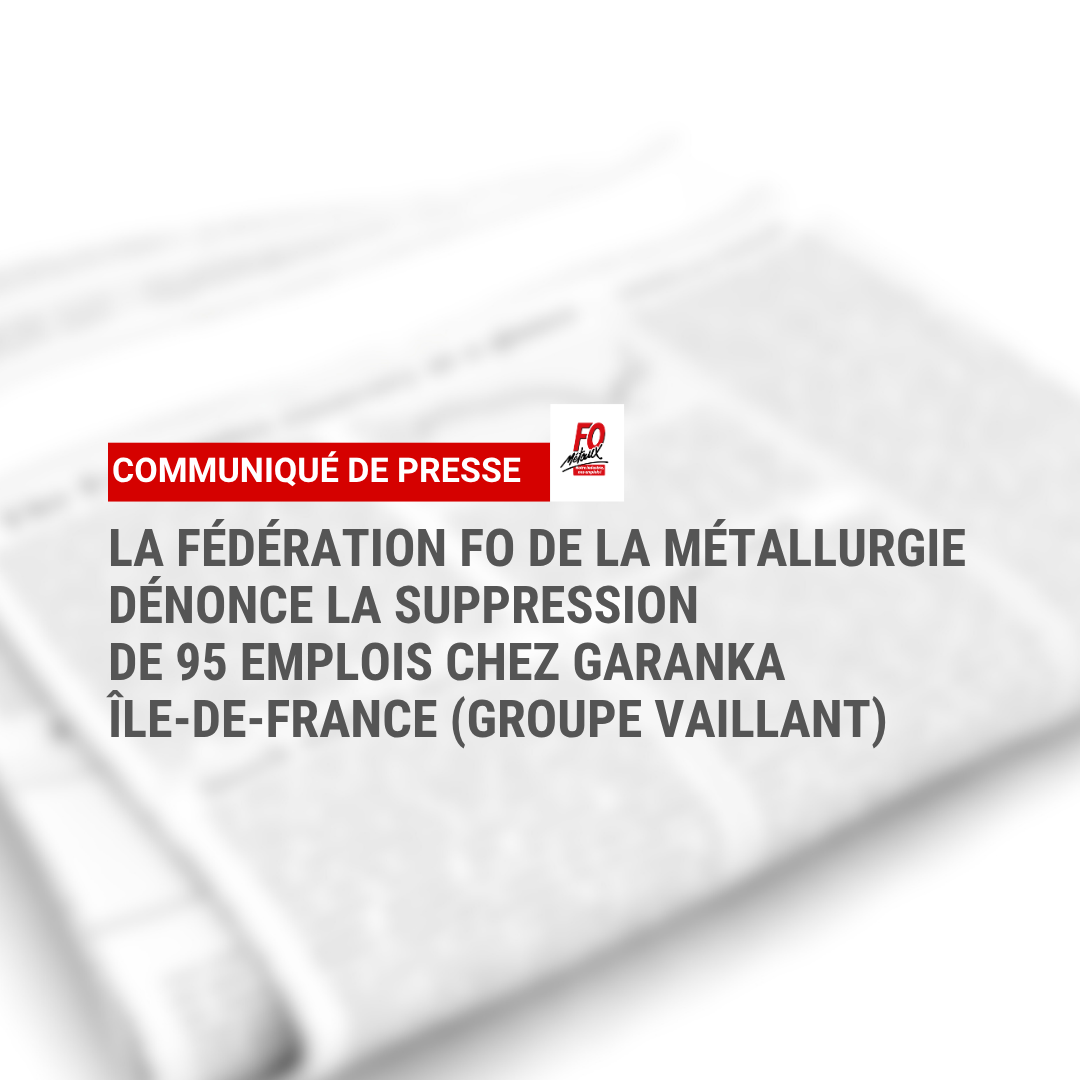 La Fédération FO de la Métallurgie condamne avec la plus grande fermeté l’annonce de la suppression de 95 emplois au sein de la société GARANKA Île-de-France SAS, filiale du Groupe Vaillant, spécialisée dans l’entretien, la maintenance et l’installation de systèmes de chauffage.